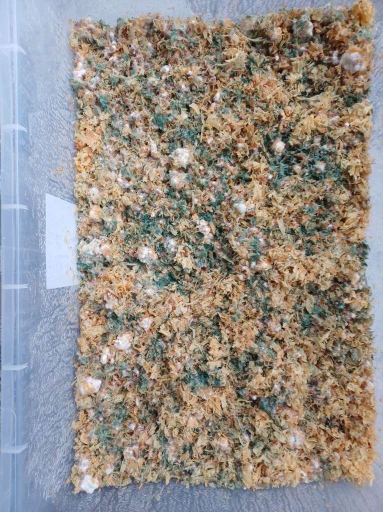 It’s taken me from September 2025 till mid January 2026 to produce anything that looks even remotely like a mycelium composite piece. In this case a set of 3 approximately 1cm x 2cm x 8cm bricks. They haven’t colonised as well as I would have liked and they’re nowhere near the ‘as strong as concrete’ that I’ve read they should be.