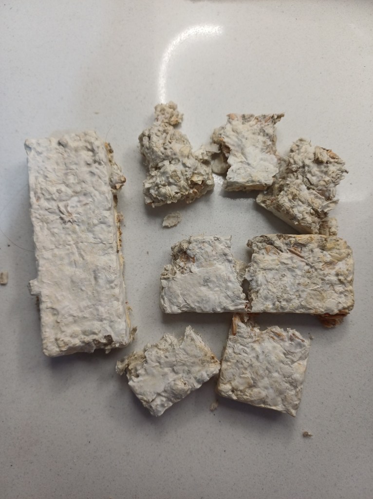 These are my first Blue Oyster Mycelium/Rye grain/recycled paper pellet bricks.
